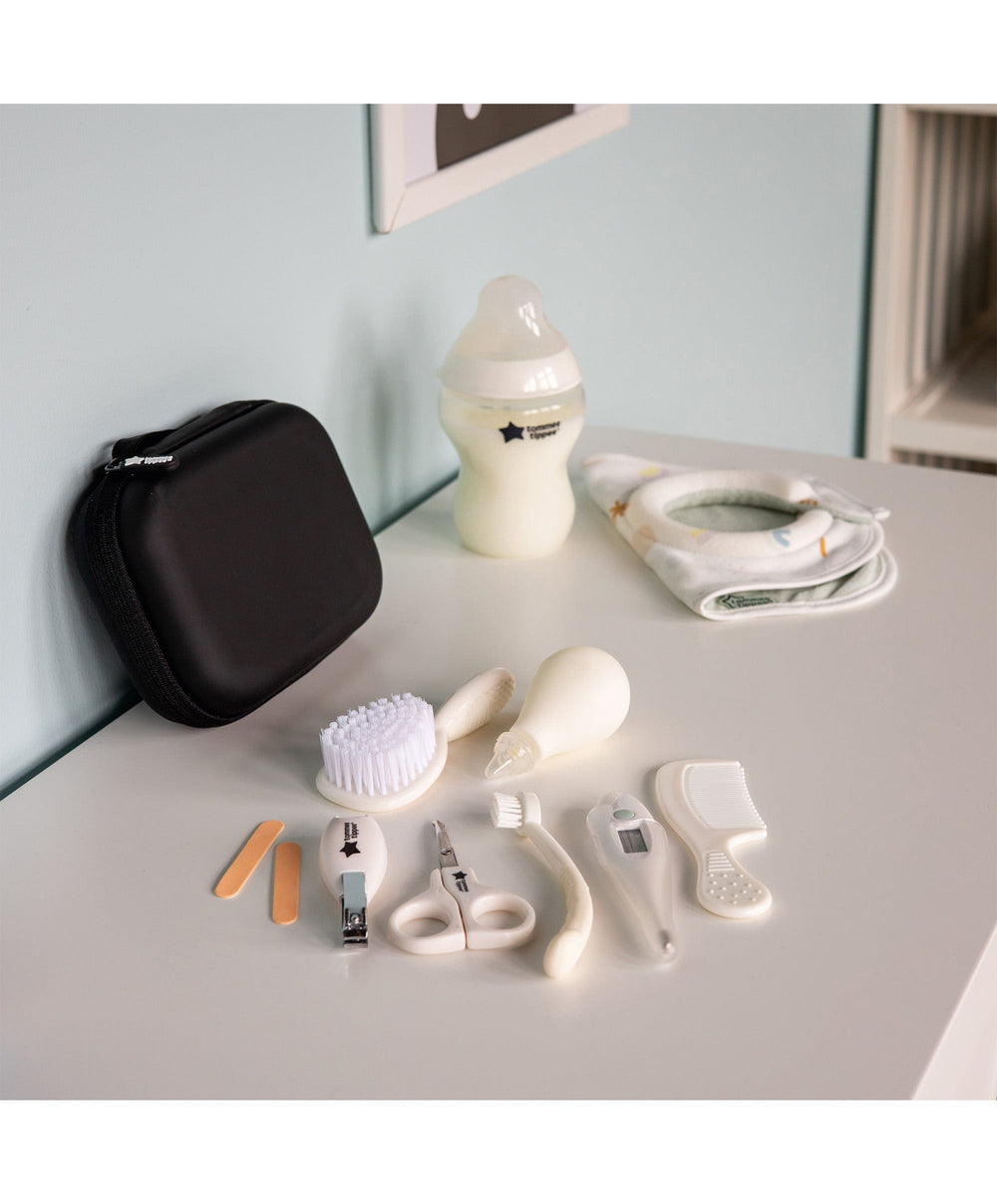 The Tommee Tippee® Closer to Nature® healthcare and grooming kit is complete with a thermometer, nasal aspirator, toothbrush, 2 emery boards, nail clippers, scissors, brush and comb. These 9 essentials are neatly packed in a convenient pouch - ideal for fuss-free travelling. The multipurpose, high-quality contents make the perfect gift for new parents.