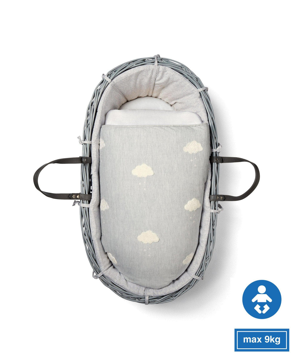 Moses basket, lined with soft jersey cotton. With useful carry handles for moving baby about the house. Beautiful cloud embroidery, perfect for co-ordinating with the rest of our Dream Upon a Cloud interiors collection.