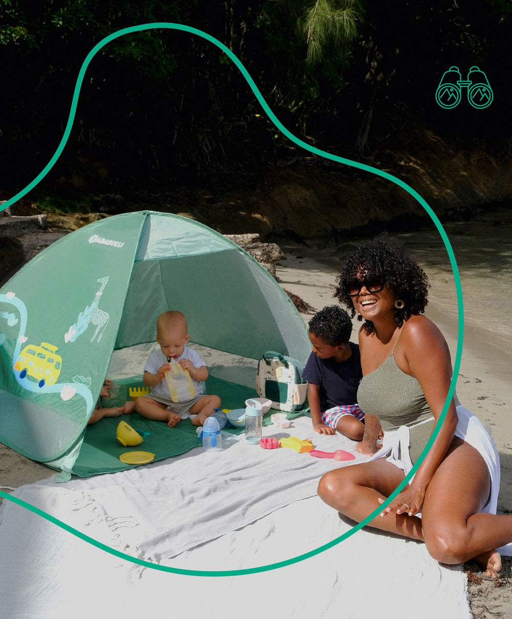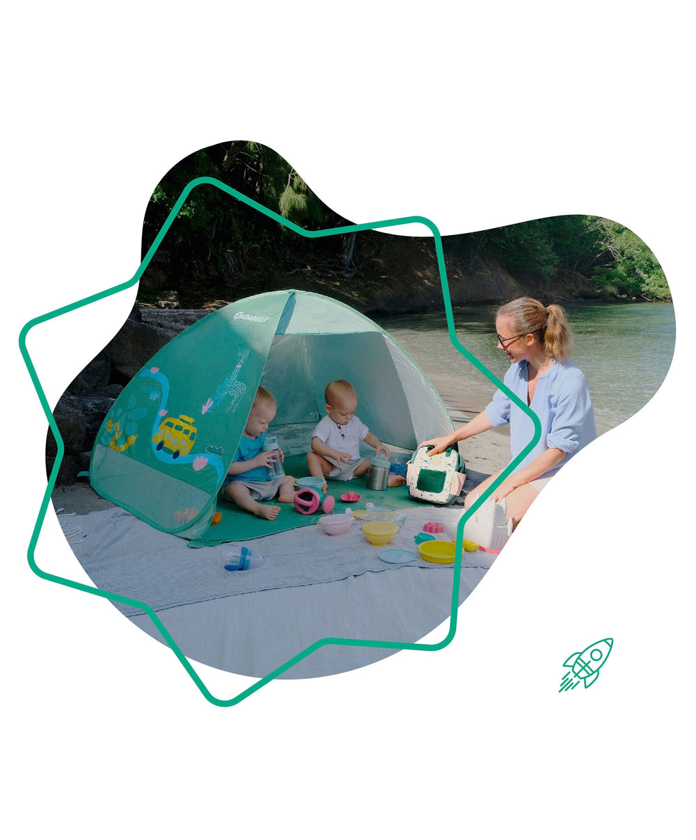 In the garden, on the beach or in the park, for playing or napping, the Badabulle anti-UV tent protects your baby and toddler from the sun as well as wind and sand. Highly practical, the tent opens up and folds down in just a few seconds with its pop-up system. Once opened, you can fix it to the ground using the four pegs provided to keep it firmly in place.