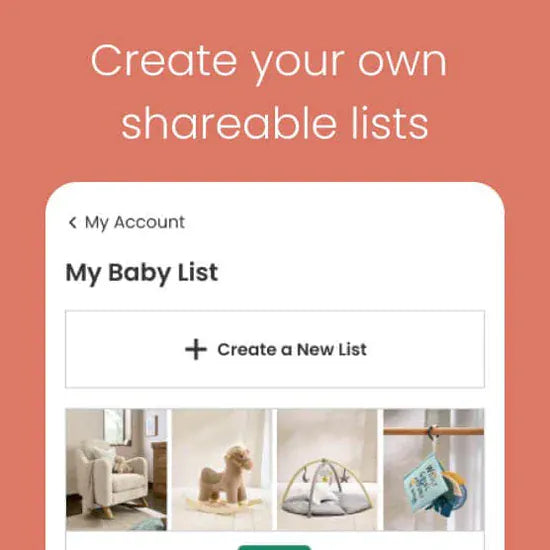Yes, you can create multiple Baby Lists to organise and keep track of the things you’d like to save for later or share with loved ones. Simply head to My Account > My Baby List and select Create List, then give your list a name, e.g. ‘Newborn Checklist’, ‘Hospital Bag’, ‘Baby Shower Gifts’. To add items, tap the ticked heart icon on any product page and choose the list you’d like to save it to.