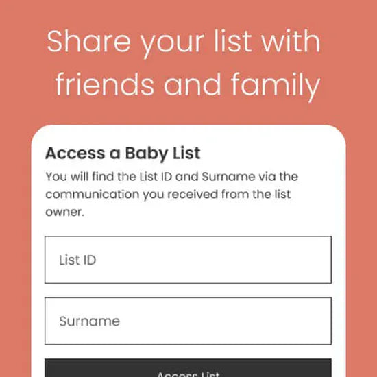 You can share your Baby List(s) with loved ones directly by sending them a link via email, text, or social media. Only people with the link can view it, and they don’t need a Mamas & Papas account to access it. Alternatively, you can share your account surname and list ID with friends and family, who can then search for your list here.