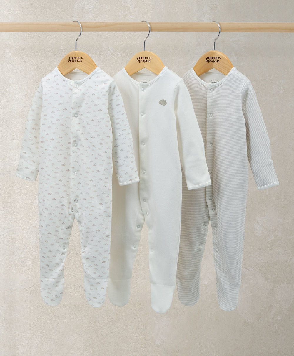 Handy 3-pack of 100% cotton, long-sleeved sleepsuits with popper fastening down front centre and at gusset.