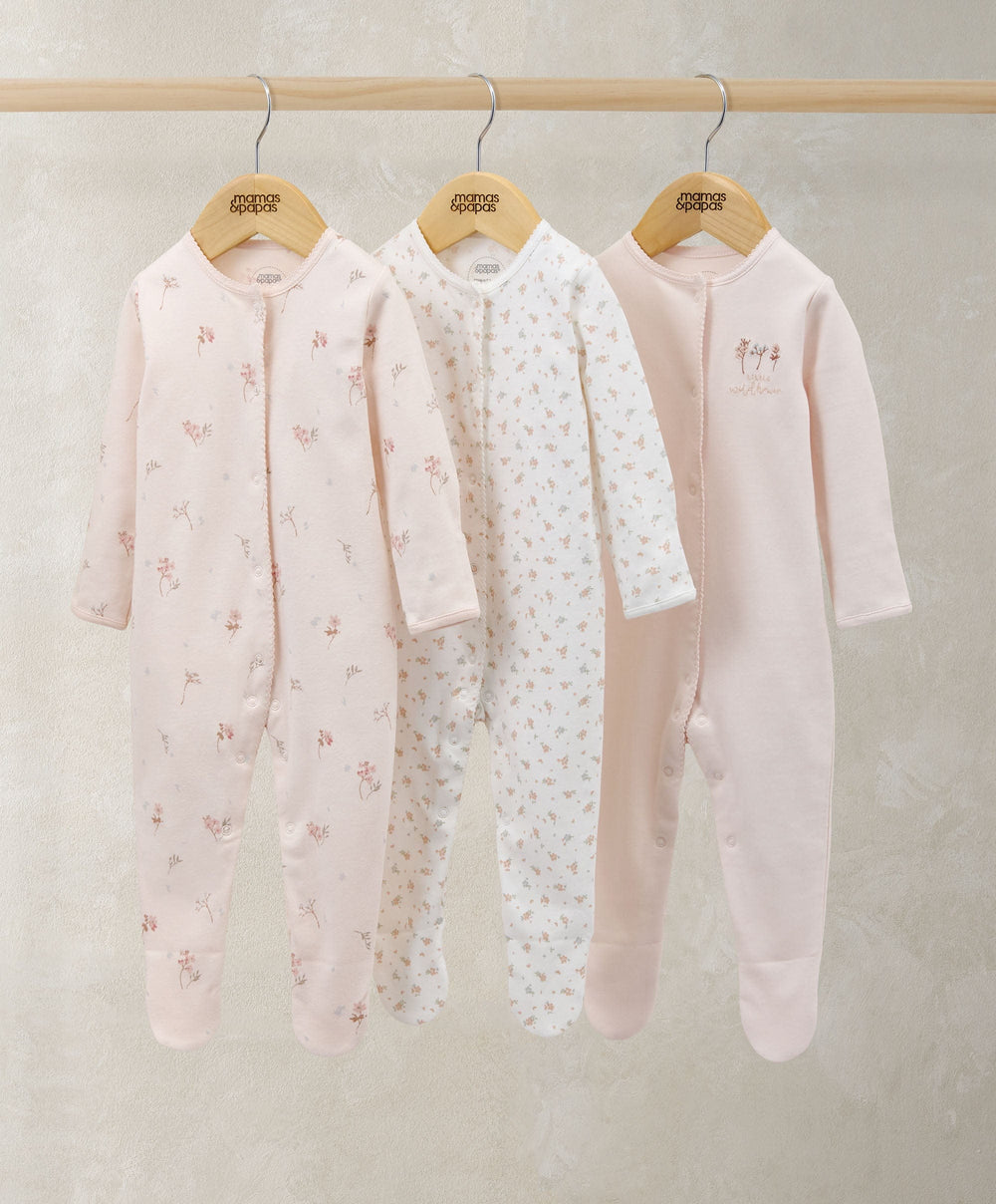 Handy 3-pack of 100% cotton, long-sleeved sleepsuits with popper fastening down front centre and at gusset.