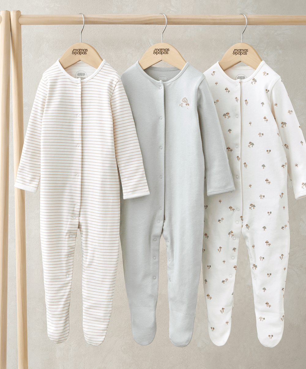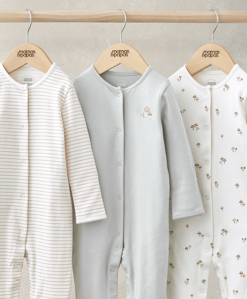 Handy 3-pack of long-sleeved sleepsuits with front and crotch popper openings, integral scratch mitts and cosy cut-and-sew feet. In various mushroom-themed designs.