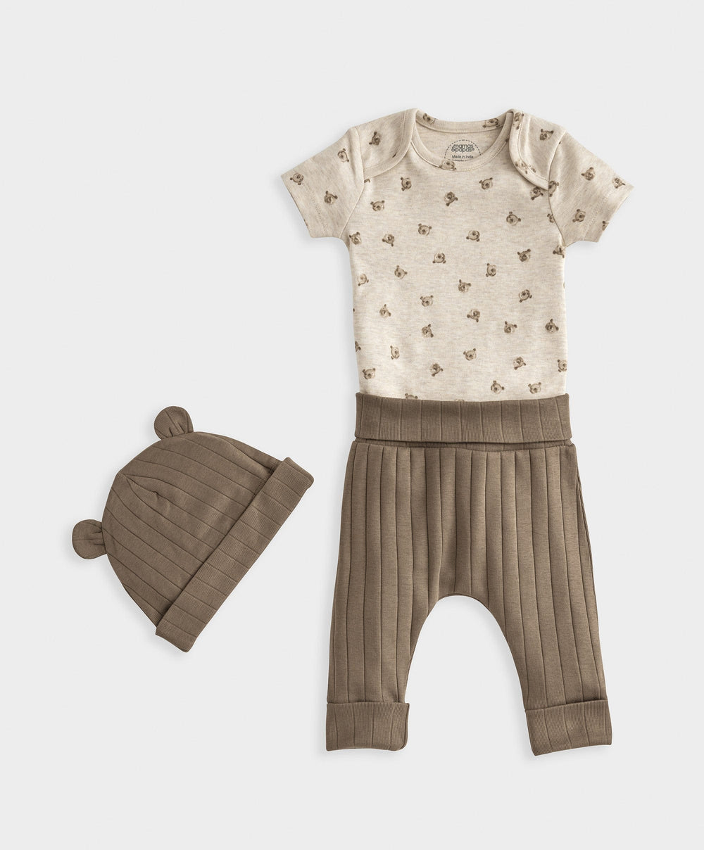 Adorable 100% cotton 3 piece set featuring a bear head print bodysuit, matching leggings and a hat with 3D bear ears.