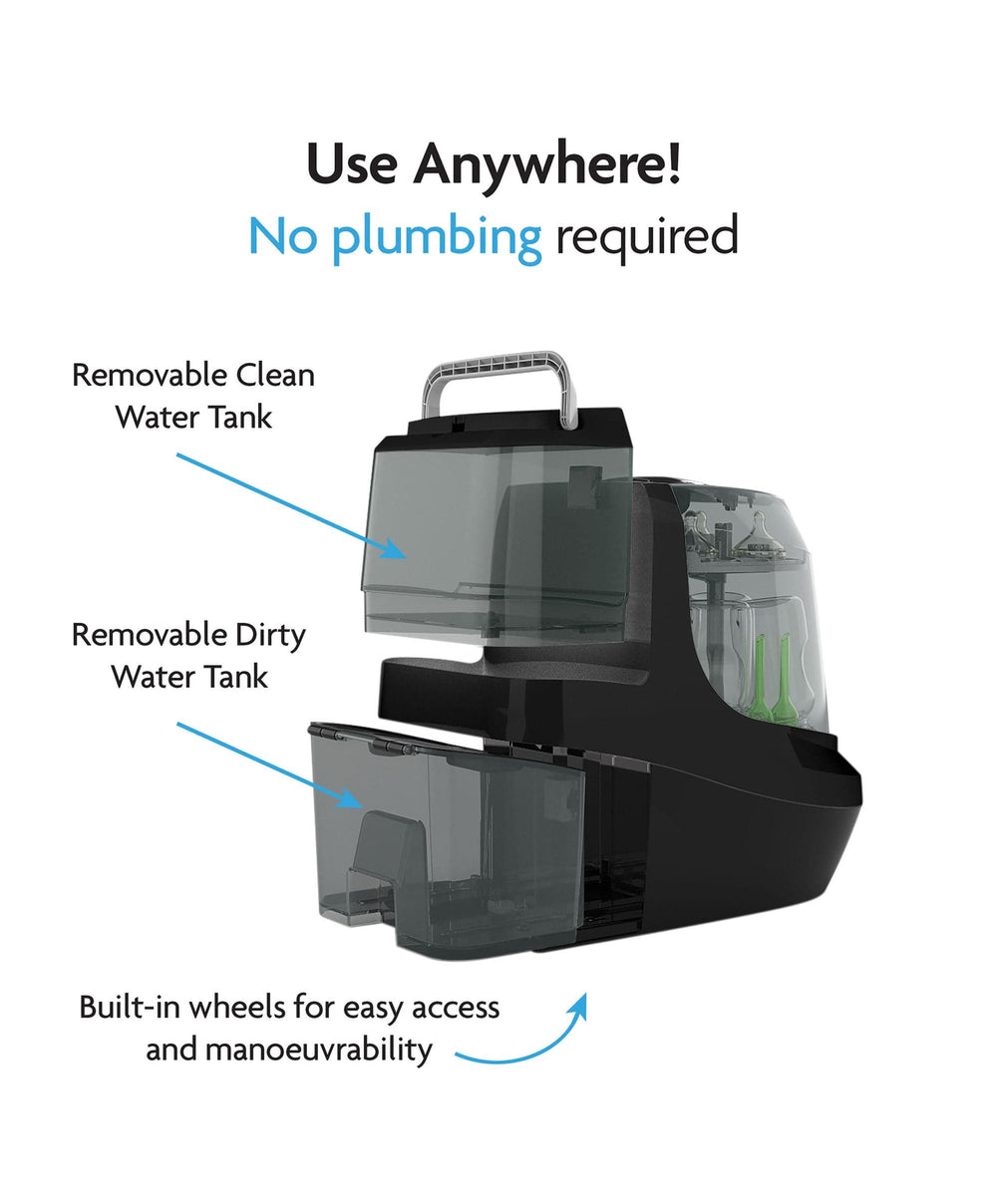 - No external plumbing required, thanks to removable clean and dirty water tanks