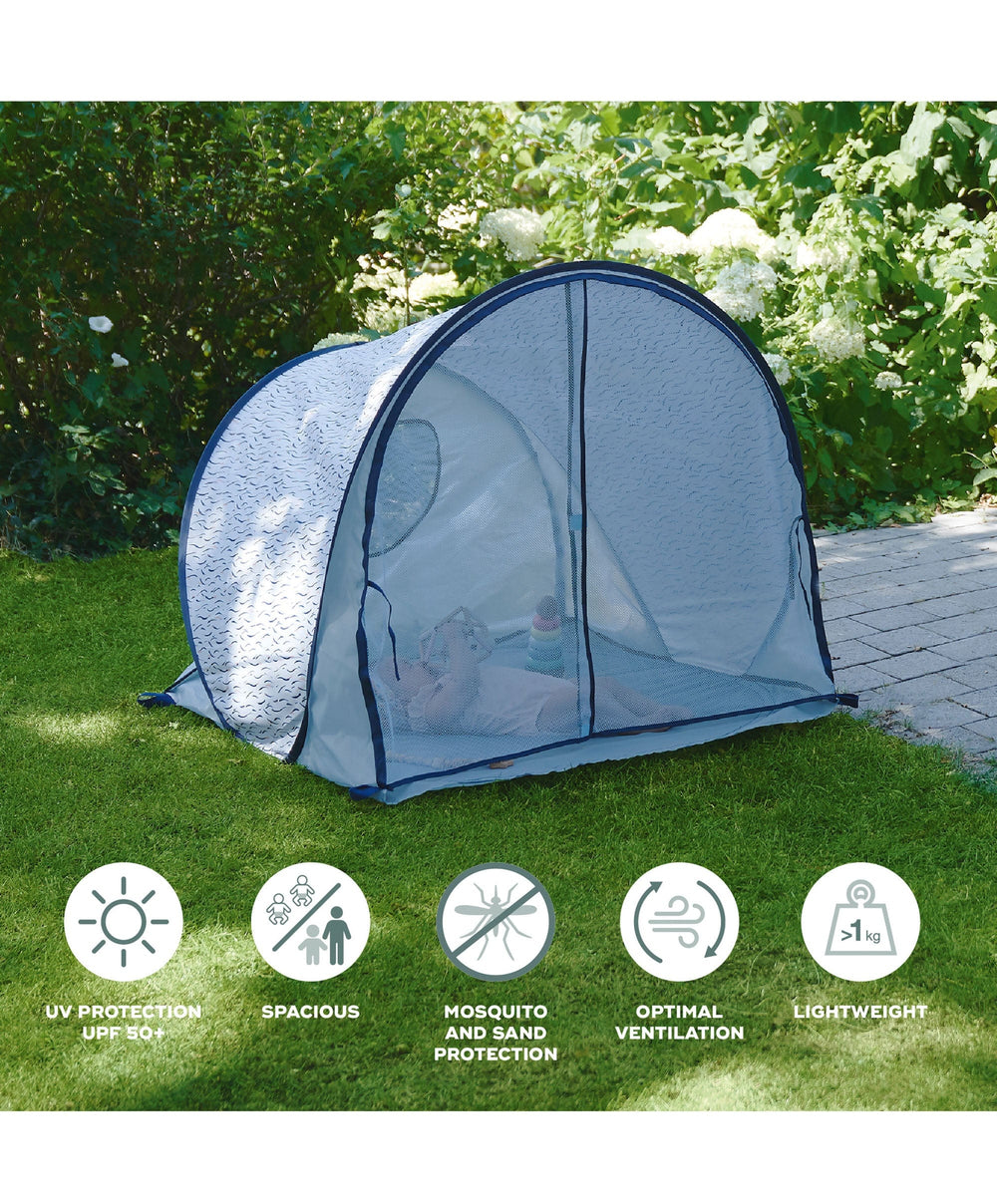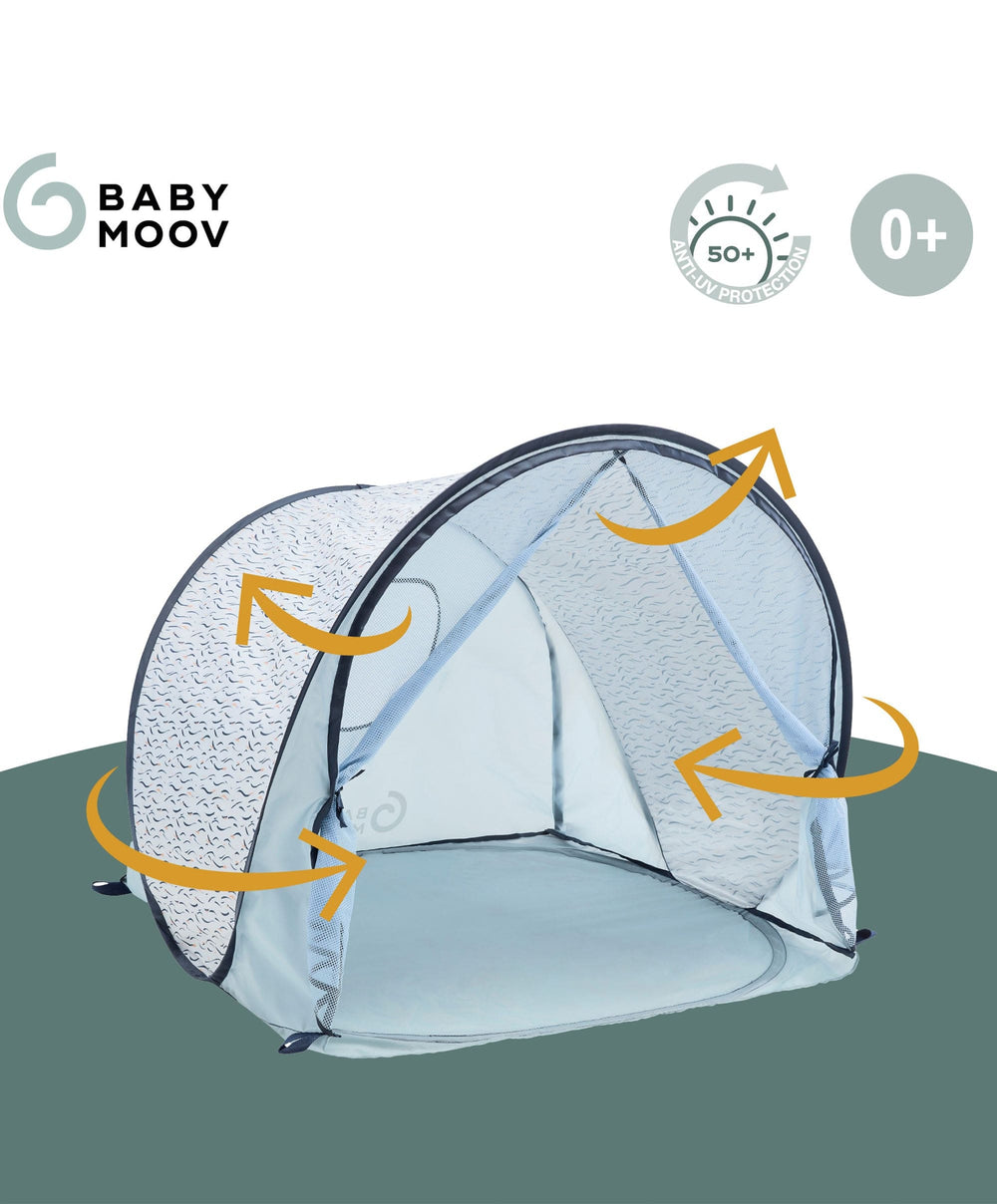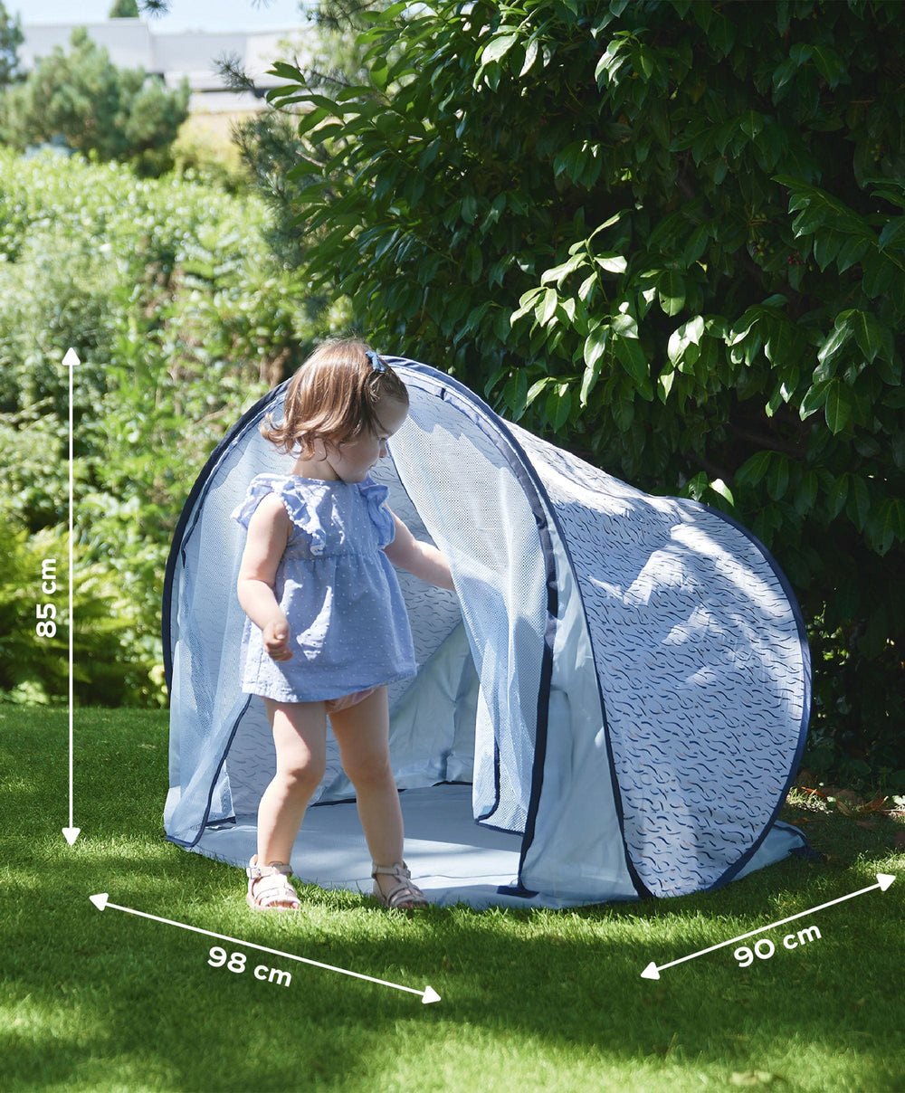 - The Blue Wave anti-UV play area protects your baby not only from the sun’s rays but also from wind and sand. With its high protection (SPF 50+), it blocks up to 99% of harmful rays (UVA and UVB).