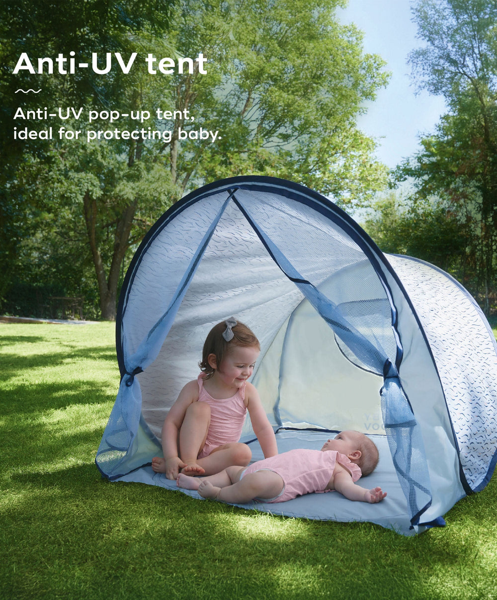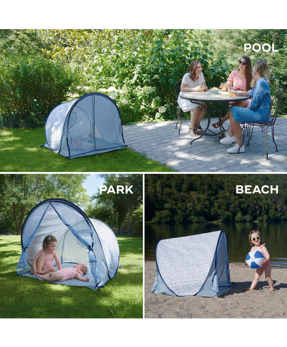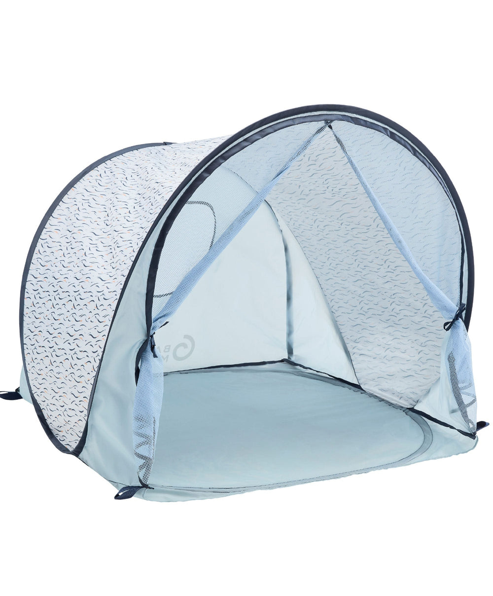 - The Blue Wave anti-UV play area protects your baby not only from the sun’s rays but also from wind and sand. With its high protection (SPF 50+), it blocks up to 99% of harmful rays (UVA and UVB).