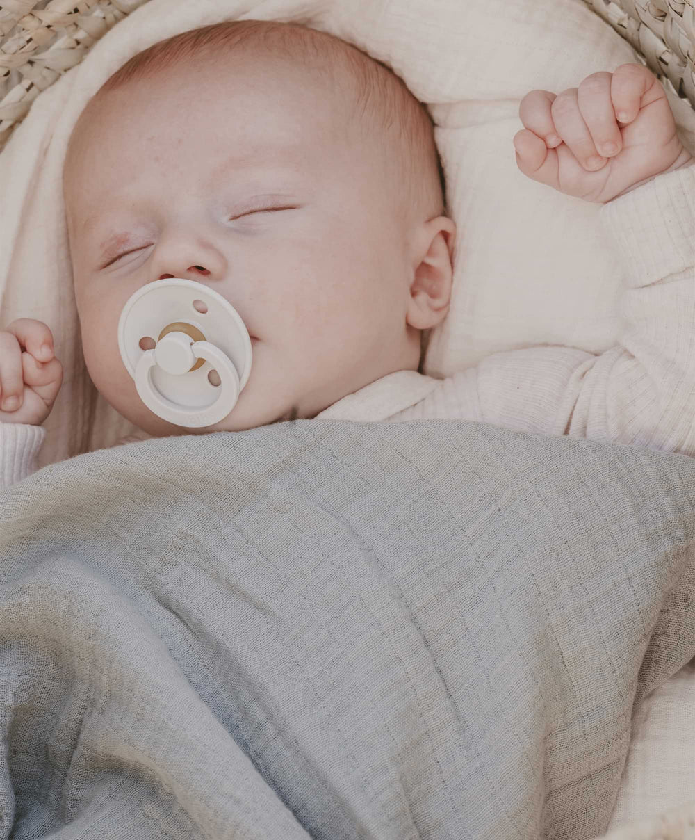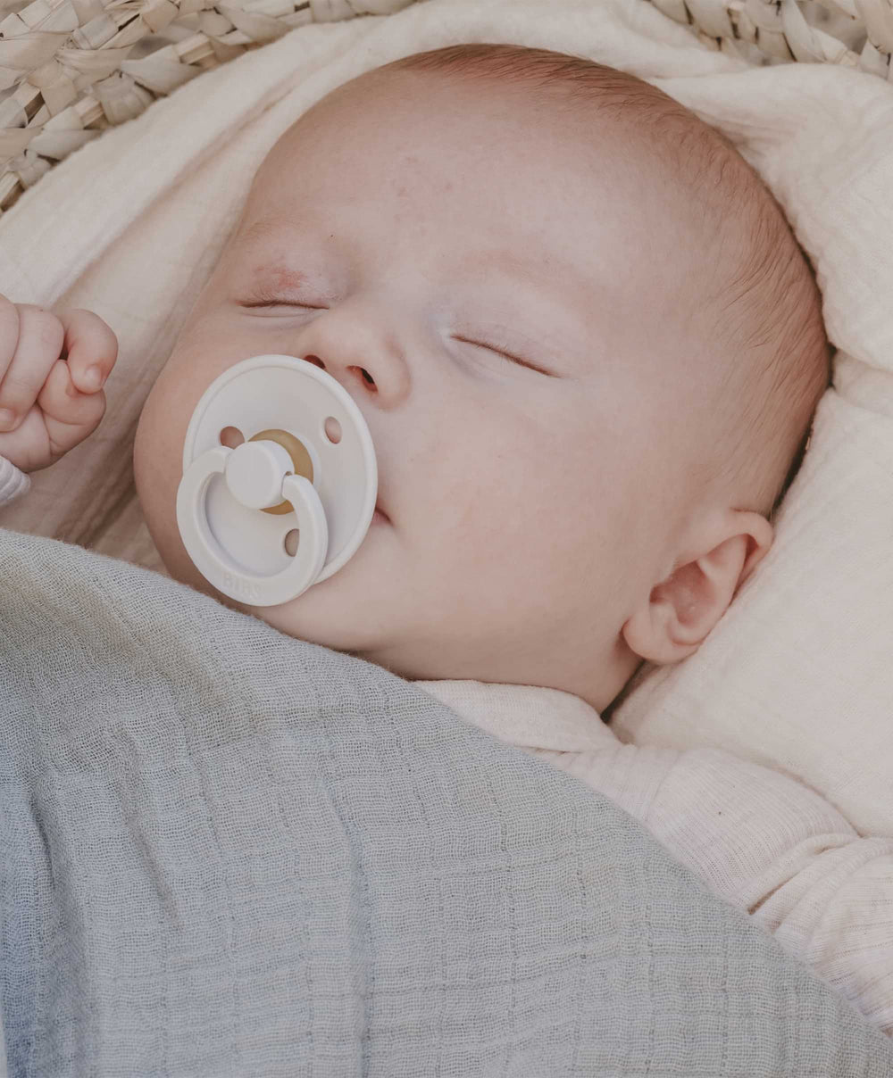 The round nipple is designed to resemble the shape and size of the mother’s soft nipple. It is designed to promote a similar tongue placement and sucking technique as when breastfeeding, as the baby must roll the tongue around the pacifier to hold it. The same technique is used when breastfeeding and requires oral muscle strength.