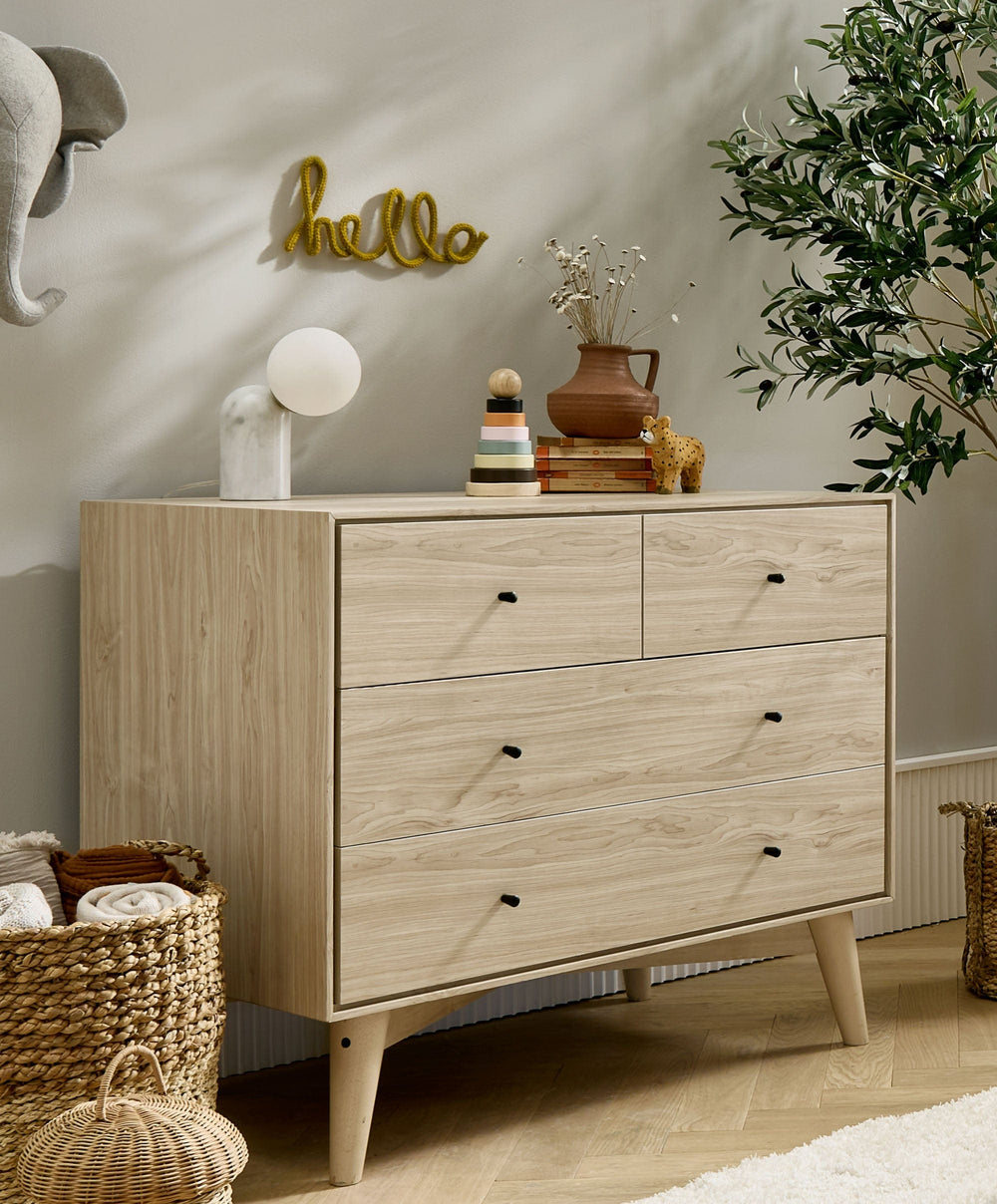 The Coxley dresser not only oozes style and finesse, it also has a very versatile side. The flexibility to change the colour of the drawer fronts allows you to customize to suit style of nursery, and adding to the longevity of this range. Not forgetting the removable changing top which takes the dresser from a handy baby changing unit to a sleek dresser that can be dressed with all your toddlers favourite toys and keepsakes.