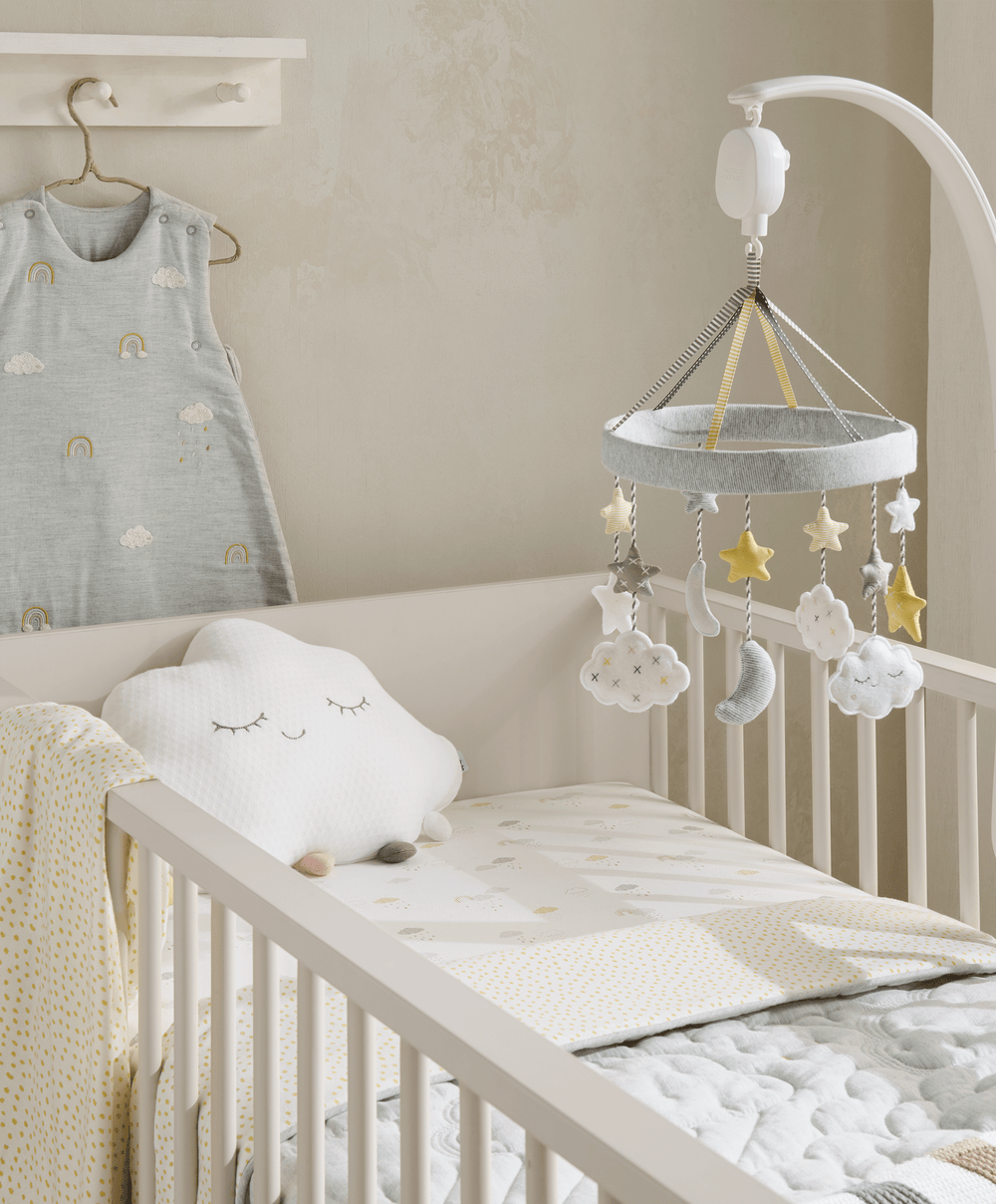 There are plenty of things you can do to create a calm nursery environment. A cot mobile hung safely above their bed can give them something to focus on and distract them if you aren't in the room or help them settle at bedtime. Go for nursery accessories such as a night light or projector, which provide a soothing low light for night time changes and feeds. Some super-soft cot bedding will be comfortable against your little one's delicate skin, helping them to feel calm and rested.