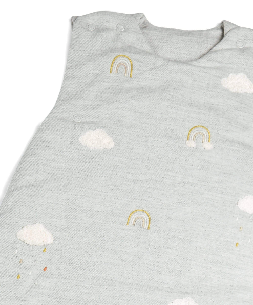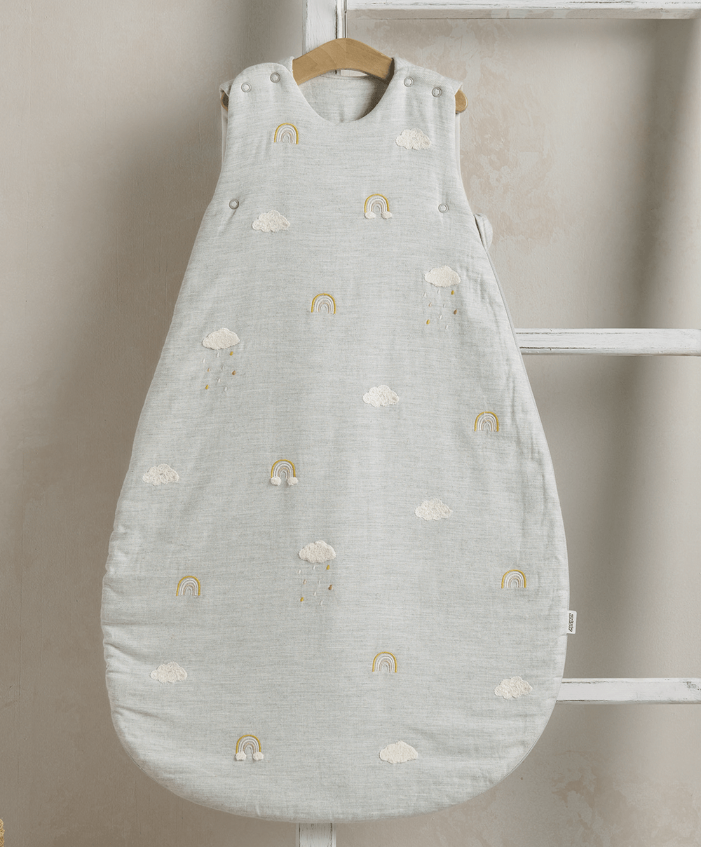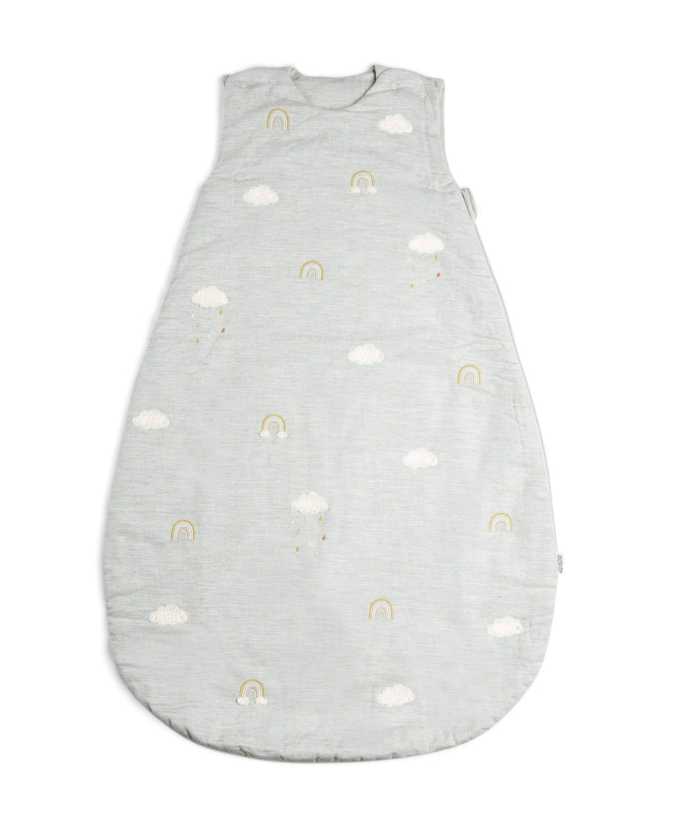 Unisex 2.5 tog dreampod suitable for 0-6months. Made from super-soft cotton that’s gentle on their skin and breathable, to encourage a healthy sleep. Features delicate cloud and rainbow print. Shoulder popper opening and zip opening.