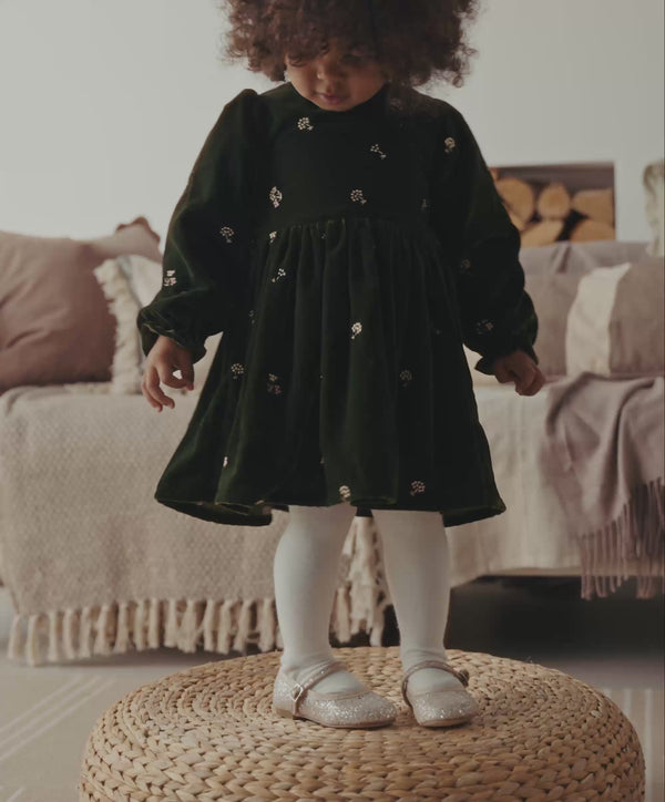 They'll be all set for seasonal celebrations and family gatherings with this gorgeous velvet dress in rich, deep green.