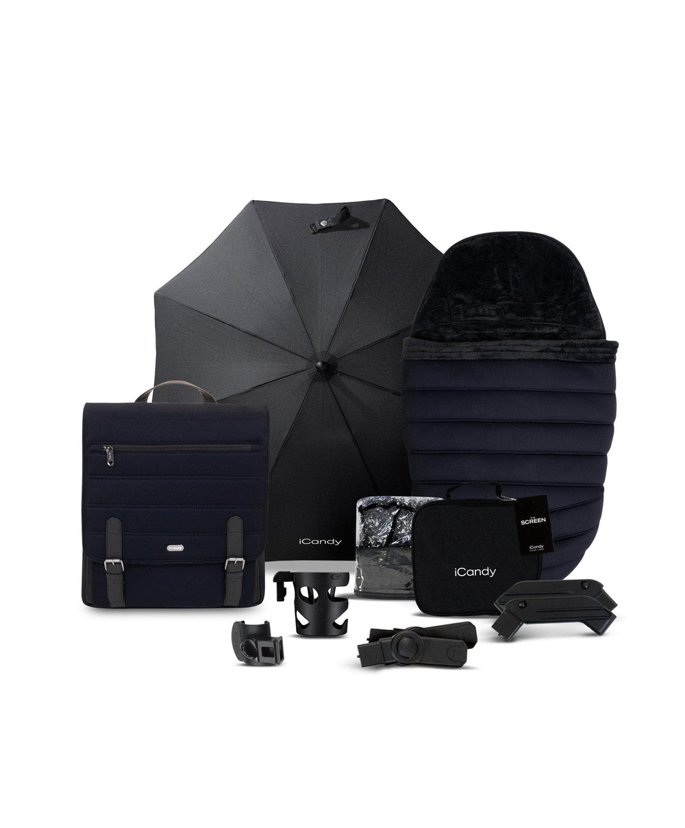 Includes accessory pack with raincover, backpack, footmuff, parasol, screen, cupholder