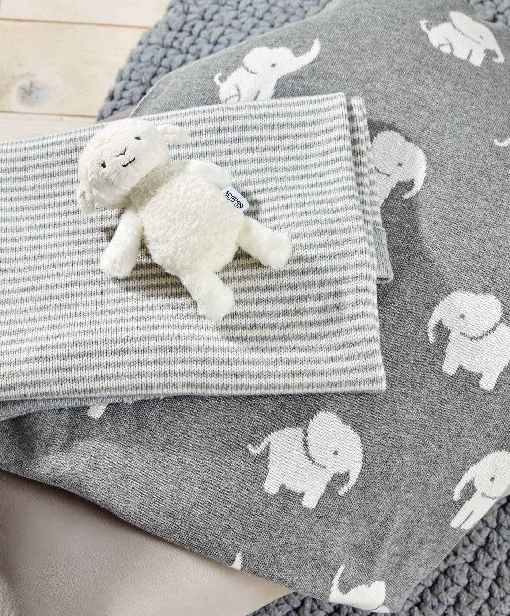 Suitable from newborn, adorable knitted blanket made from 100% soft cotton. Features neutral grey and white colours and adorable elephant print.