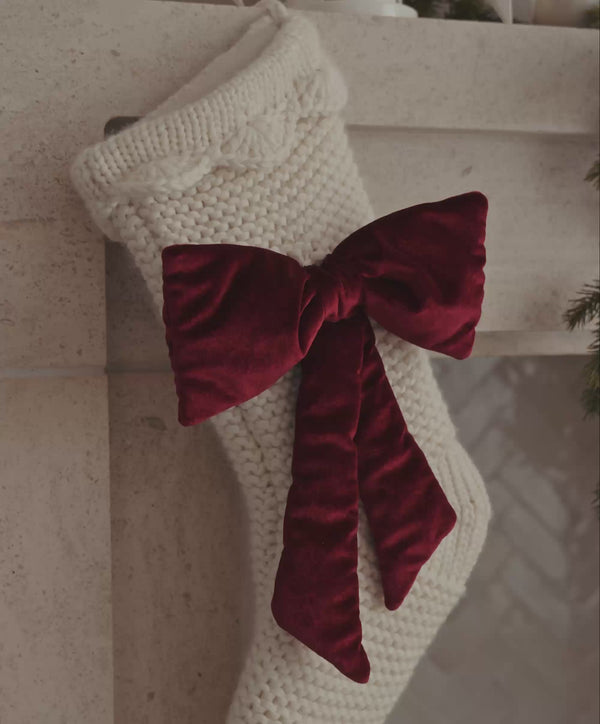 Bring luxe Christmas feels to your family home with this beautifully designed classic cable knit stocking. Crafted from soft, thick cream yarn and adorned with an oversized, plush velvet bow, it's as tactile as it is charming. The sweetest finishing touches come in the form of a removable mini Beau bunny toy and scalloped edge detailing at the opening, which mirrors Beau’s dainty lace collar.