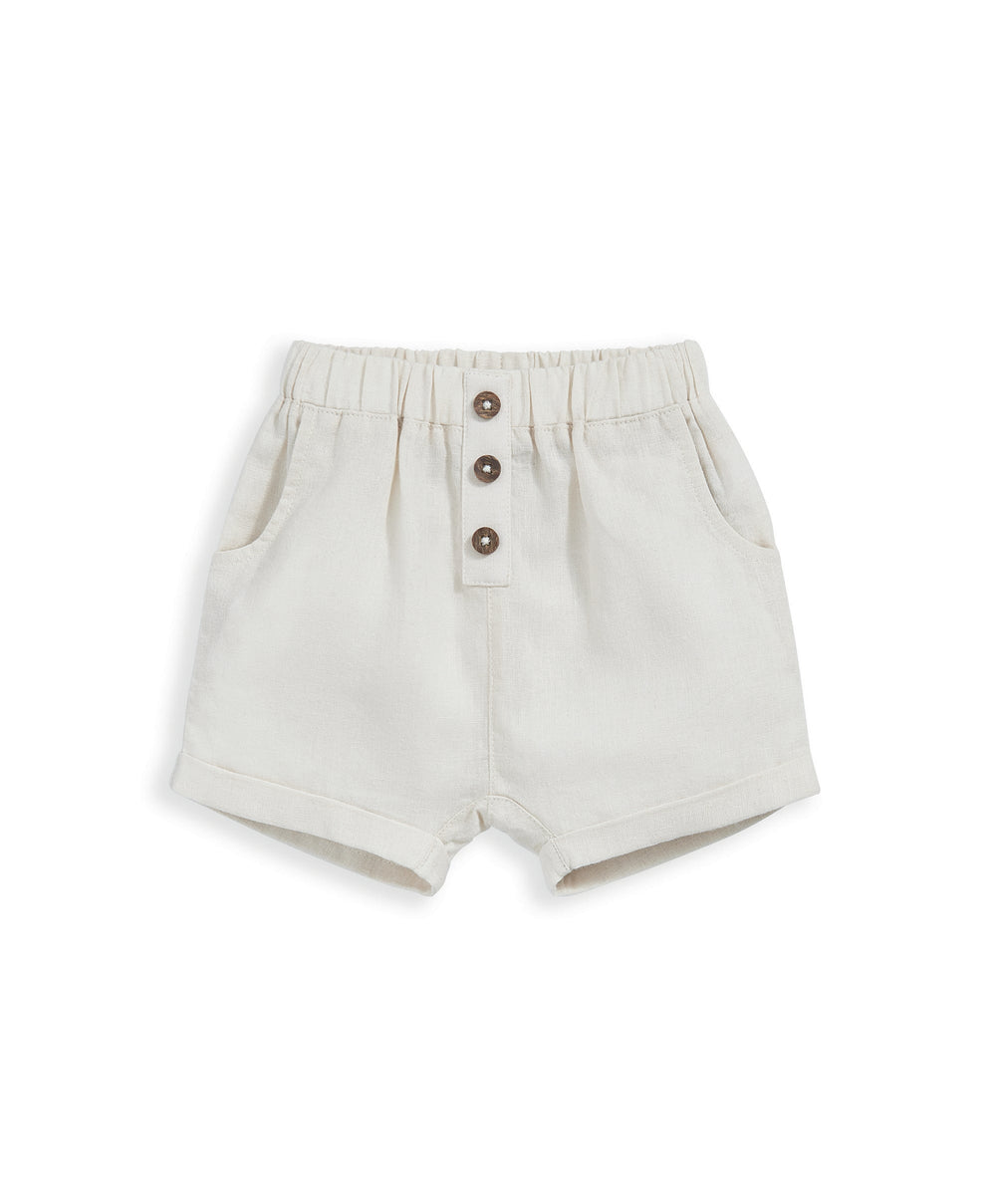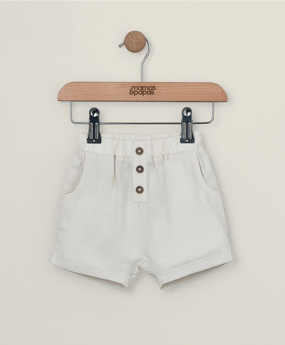Boys linen shorts. With side pockets and patch pockets at back. Elasticated waistband with non-functional button detail.