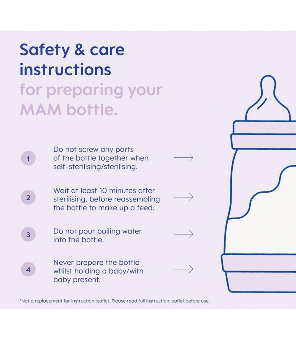 Care & Maintenance: Before first use place in boiling water for 5 minutes. This is to ensure hygiene. Before first and each use, clean in warm soapy water and rinse well with clean water before sterilising, in order to ensure hygiene. Avoid harmful ingredients in the soap such as alcohol, chlorine, and/or microplastics. Do not leave items standing in the cleaning detergent like soapy water longer than recommended – this could negatively affect the product function. All bottle parts MUST be disassembled for proper cleaning. Cleaning/sterilising while assembled can damage the bottle. Dishwasher safe on top dishwasher rack (max 65 c) but please be aware food colourants may discolour the bottle components. Do not use abrasive cleaning agents. You can clean the bottle parts with a soft bottle brush such as the MAM Soft Brush, which can also be used to gently clean inside the teat. Hard scourers may scratch the plastic. Ensure no residual food remains in the bottle parts after cleaning and sterilising. Teats MUST be replaced every 1–2 months for hygiene & safety reasons.