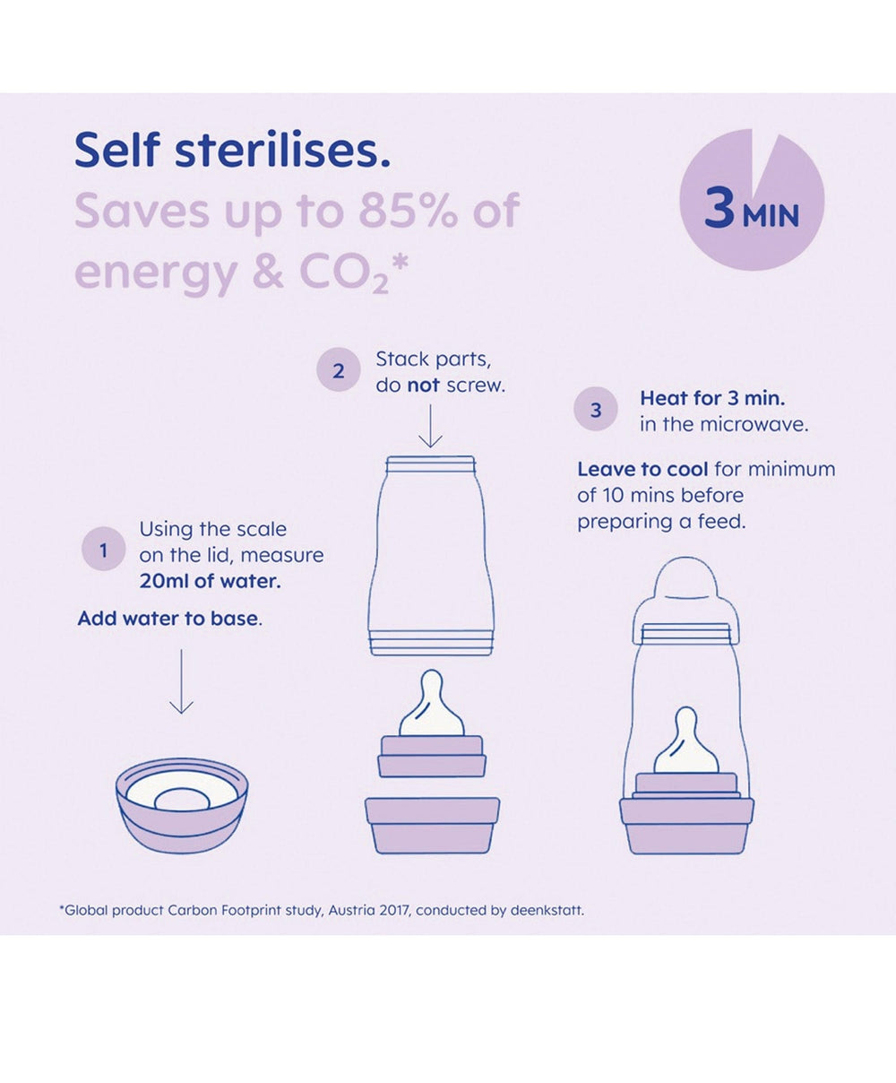 Thanks to the innovative vented base there is an even drinking flow so that babies can remain calm and relaxed without swallowing air helping to reduce colic in 80% of cases. The Easy Start Bottle self-sterilises in 3 easy steps ensuring simple safe bottle cleaning at home or on the go!