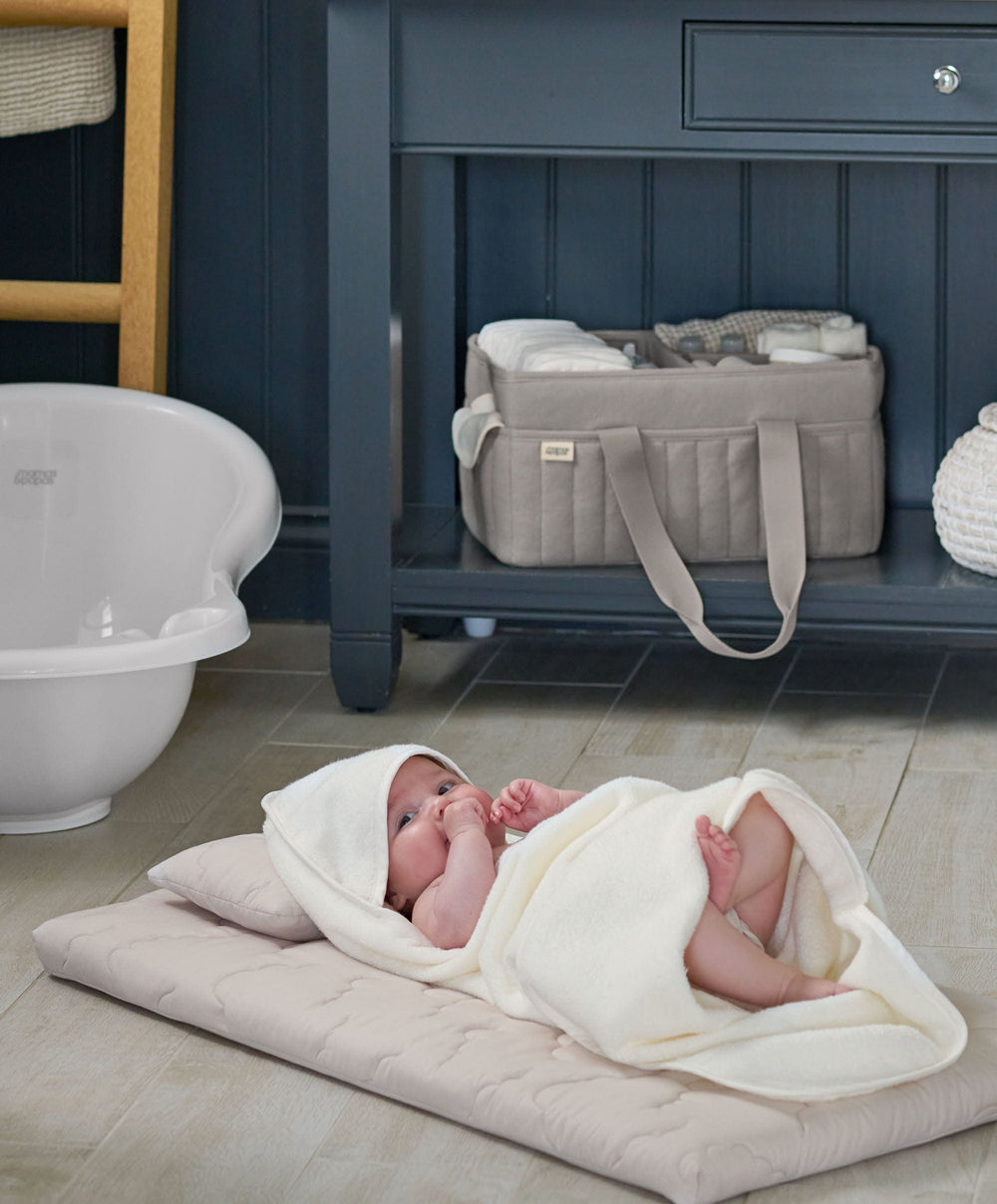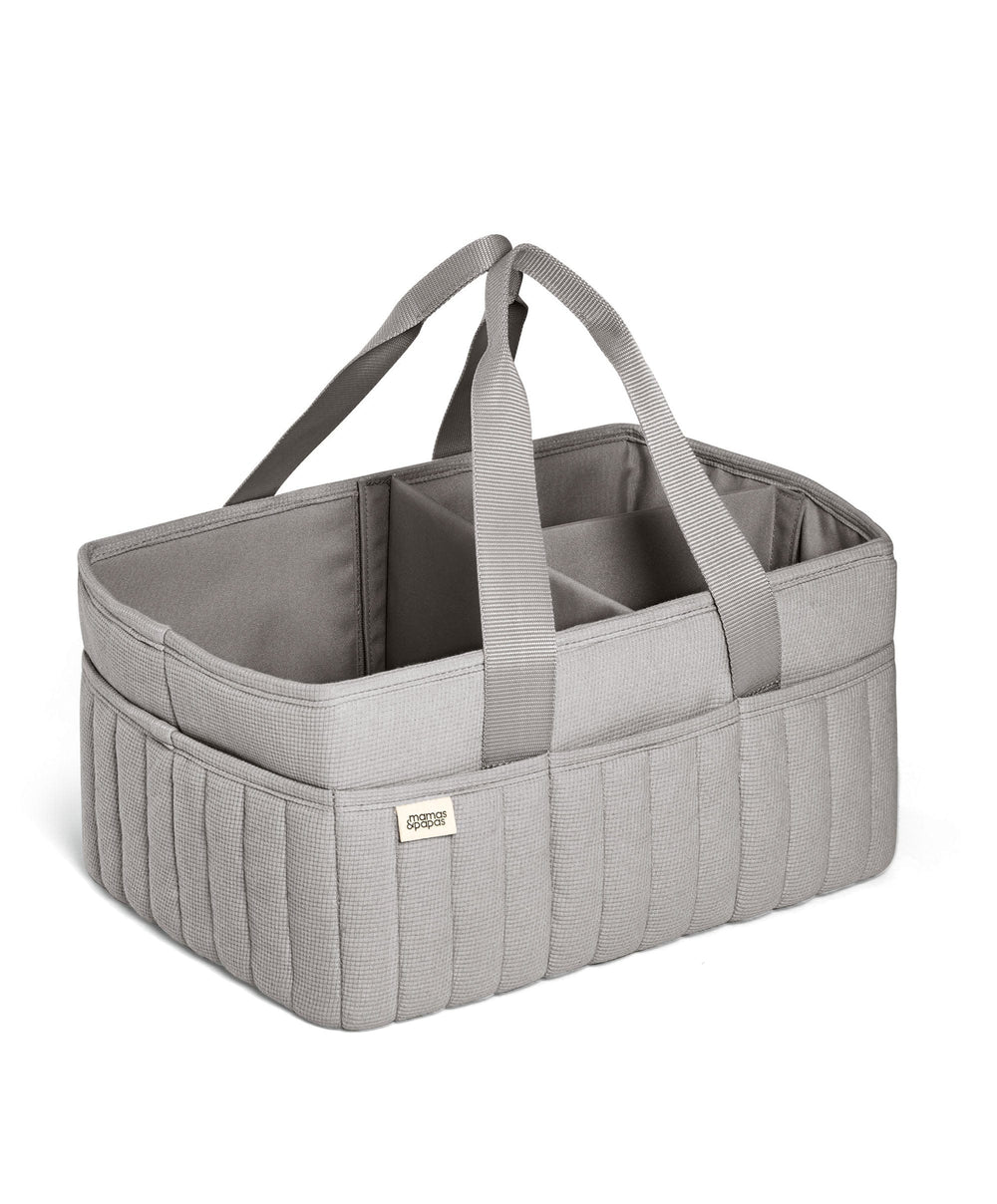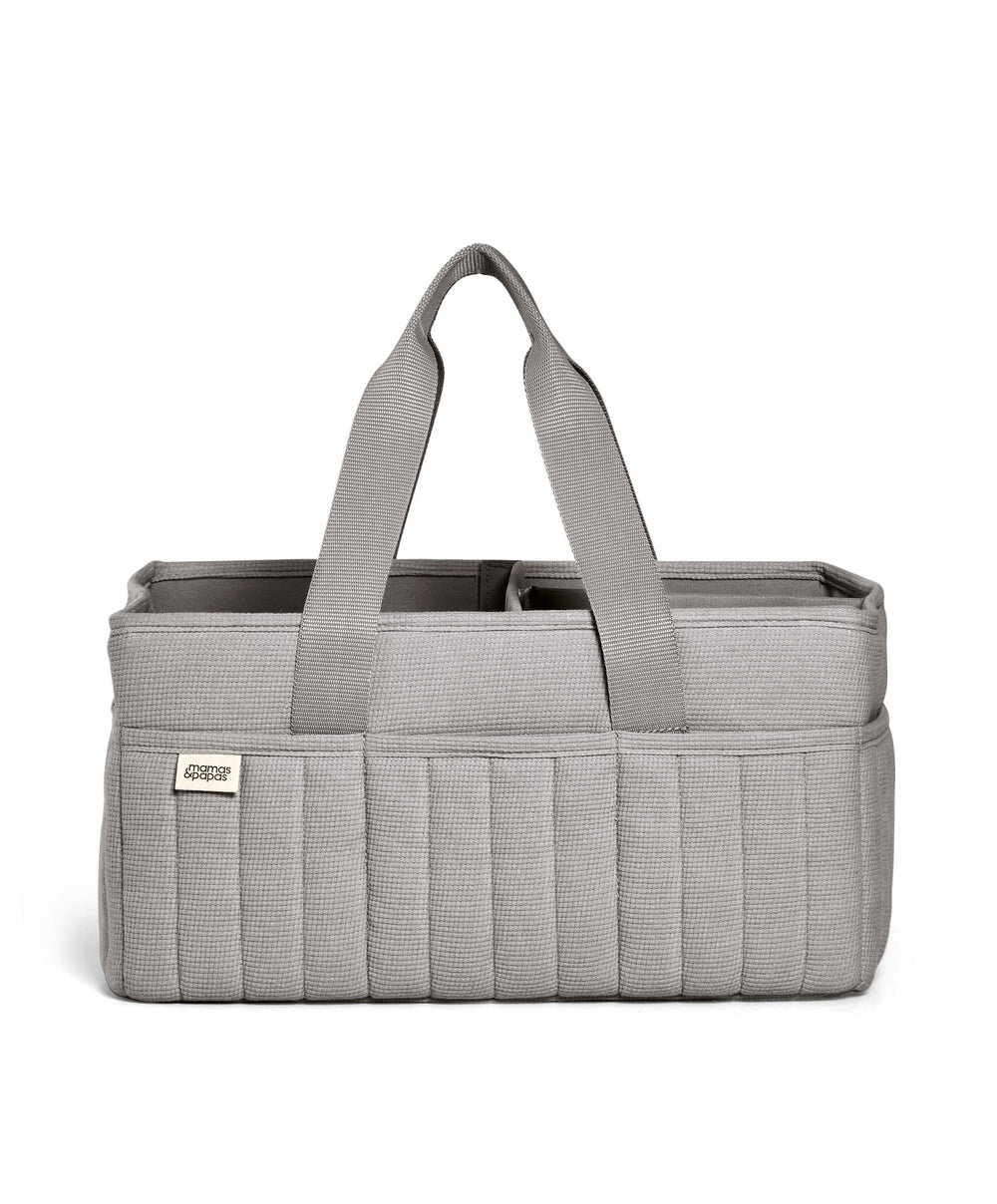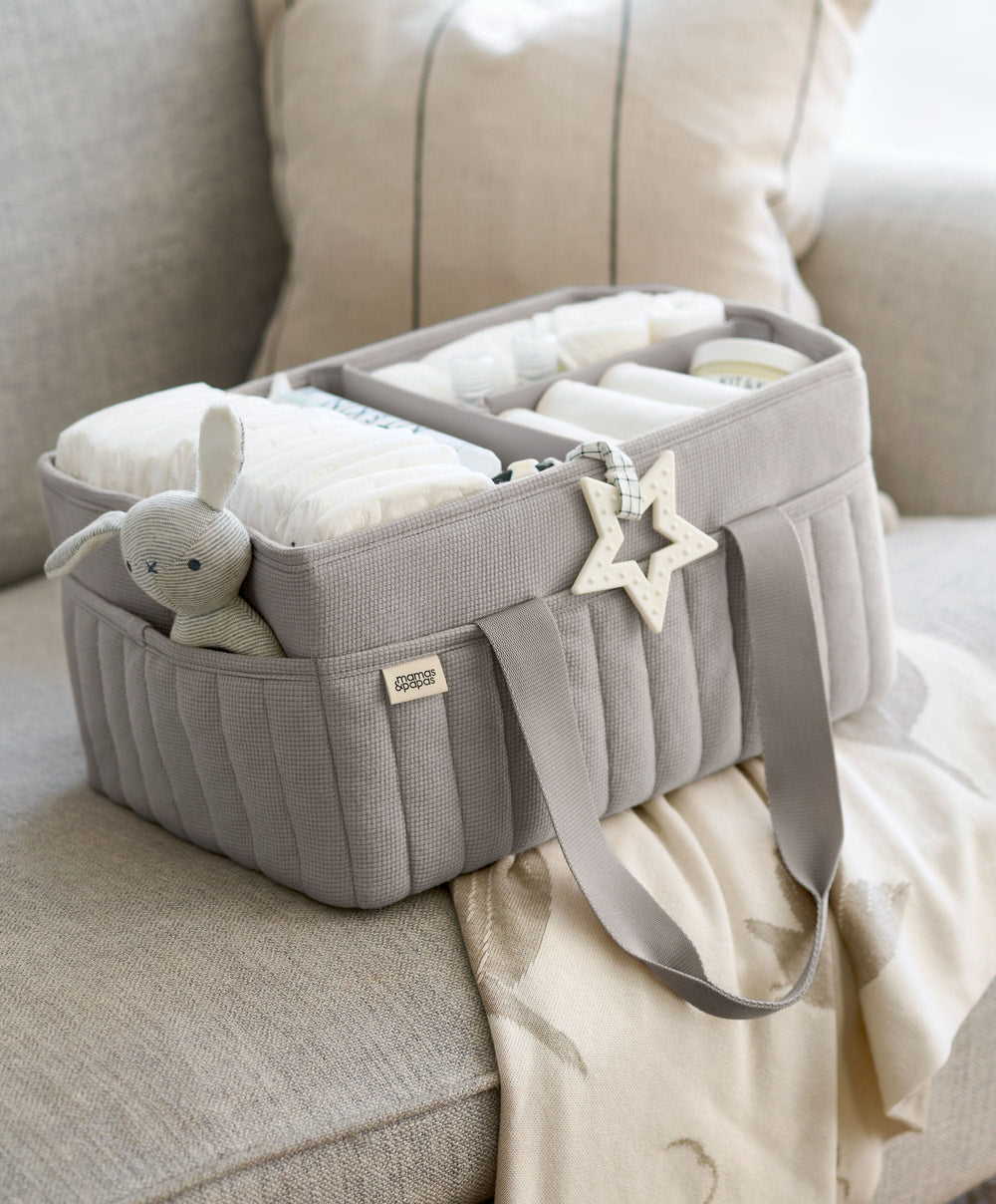 A stylish storage solution for all your changing essentials. With outer pockets and three inner compartments with removable inserts. Large handles allow you to move it easily around the house for different changing stations. Folds down flat when not in use. Made from a natural soft organic cotton waffle fabric in a beautiful soft grey shade to complement your interior.