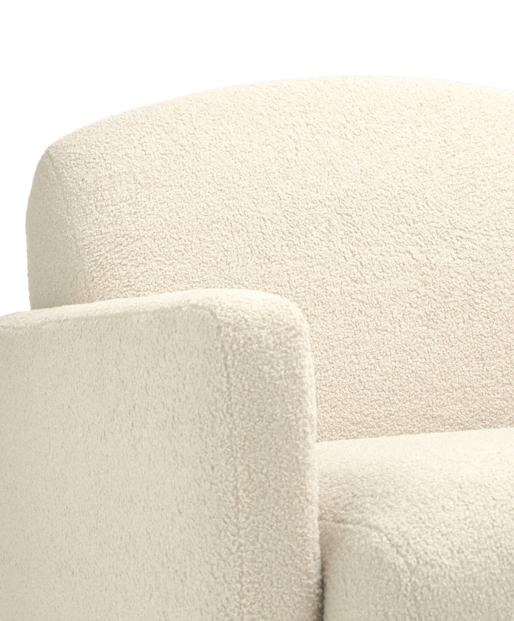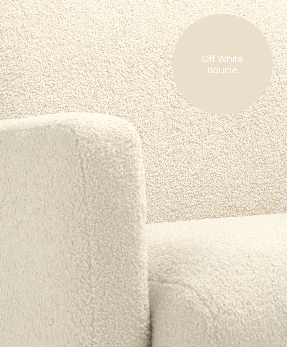 The Royton nursing chair makes a beautiful addition to any nursery, combining ergonomic features and sleek design-led styling. Inspired by interior trends it features a stylish deep seat, clean lines and curvy contours, while its ergonomic shape has been designed with feeding in mind – it has comfortable, upholstered arms; a wider seat base, suitable for using a nursing pillow and a sleek integrated rocking system, crafted from a solid oak wood rocking base, that delivers a smooth rocking motion. Our comfiest nursing chair yet, Royton has a soft cushioned comfy seat base which creates a cosy cocoon-like effect. A timeless piece of furniture with a classic design, it’s designed to suit any style of nursery but also sits effortlessly in any room, allowing you to enjoy it for years. Fully upholstered in stylish off-white boucle fabric, with a co-ordinating footstool available. Made to order in the UK.