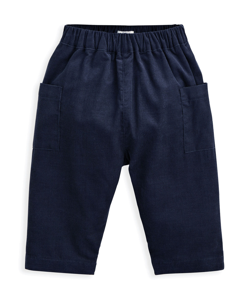 - Blue cord trousers with patch pockets