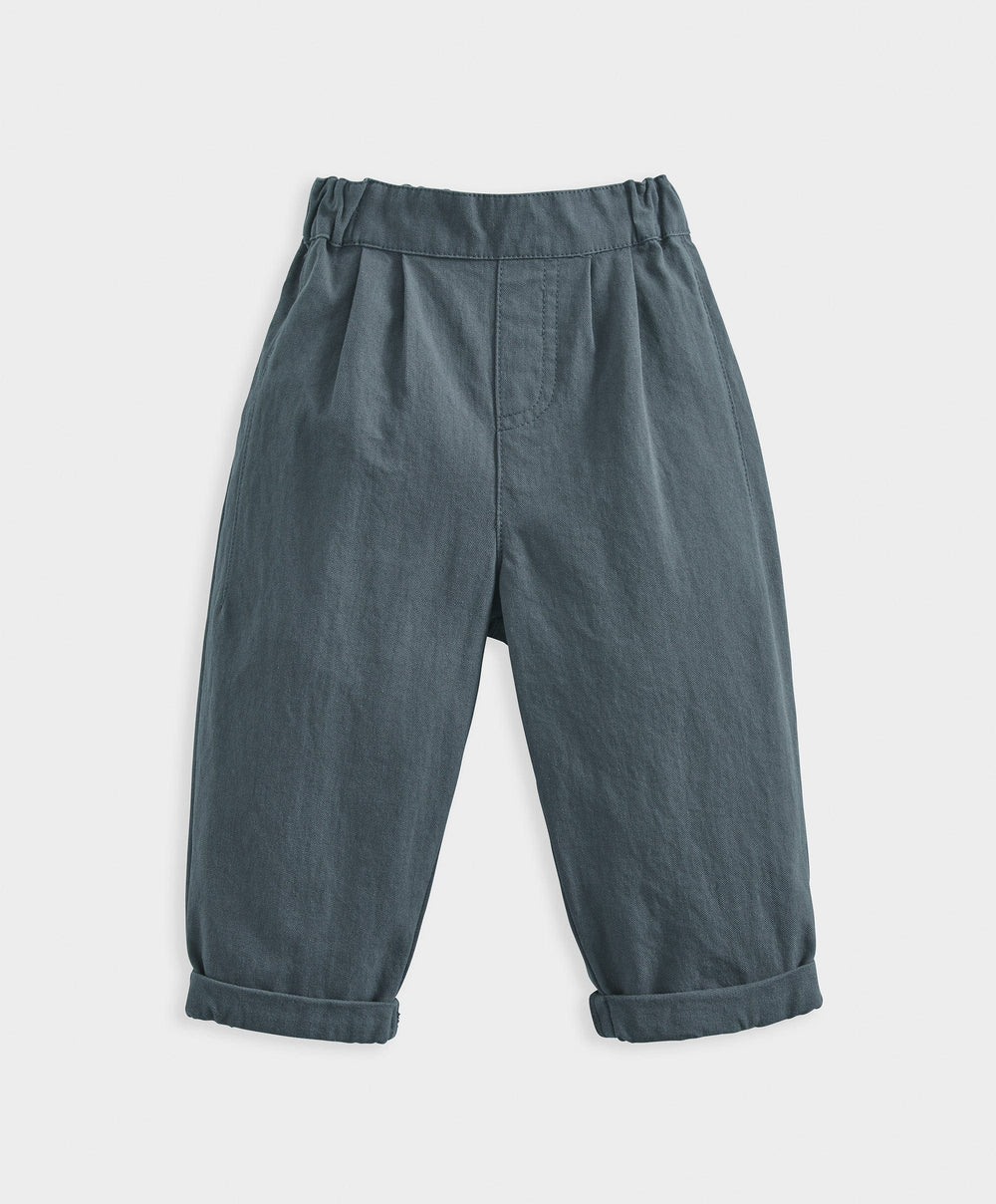 Utility trousers featuring a flat centre front waistband with mock fly stitching and an elasticated back waistband for a comfortable and secure fit.