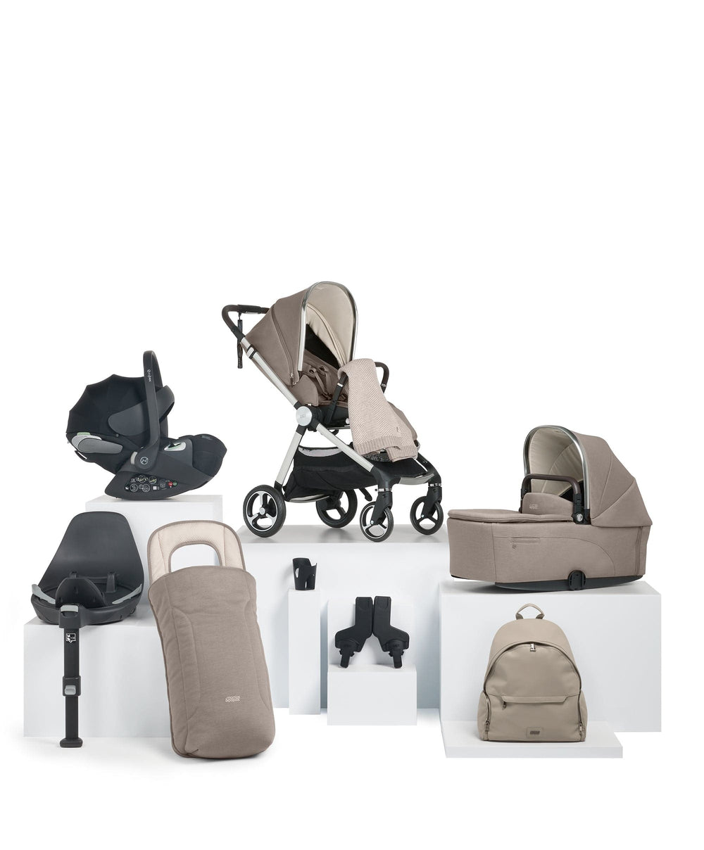 This bundle contains Vardo Pushchair, Carrycot and Footmuff - Heritage, Cybex Cloud T Car Seat – Sepia Black, Cybex Car Seat Base T – Black, Car Seat Adaptors, Cup Holder, Luxe Backpage – Taupe and Ocarro Heritage Baby Blanket