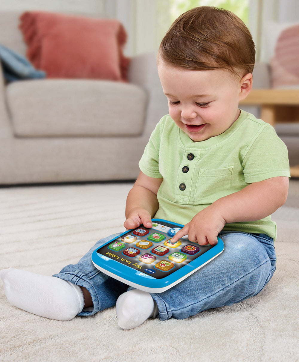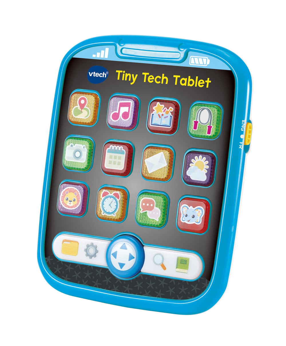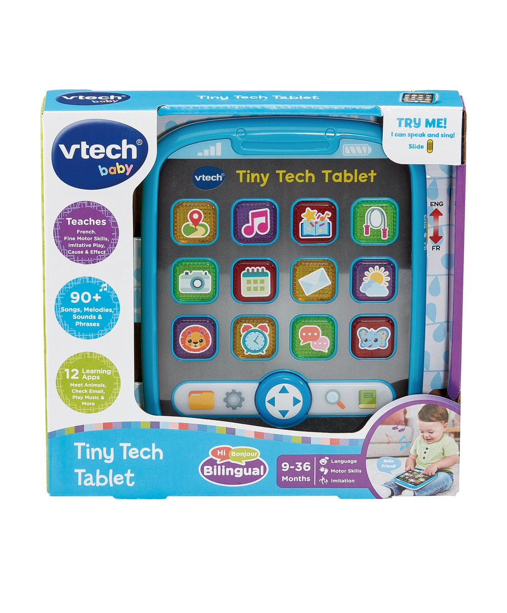 Press and learn! Your little one will have fun playing and learning with the Tiny Tech Tablet by VTech. Featuring 12 brightly coloured light-up app buttons that introduce fun phrases, music & sounds about maps, music, entertainment, exercise, mail and the weather! Message, alarm, camera and calendar buttons emulate daily tasks in a fun way, just like on an adult tablet, while the lion and elephant buttons introduce animal friends. Baby can control all this using the simple left, right and up, down controls that light up as they are pressed. Slide the switch to hear all the fun phrases again in French for a fun bilingual experience! Suitable for 9-36 months.
